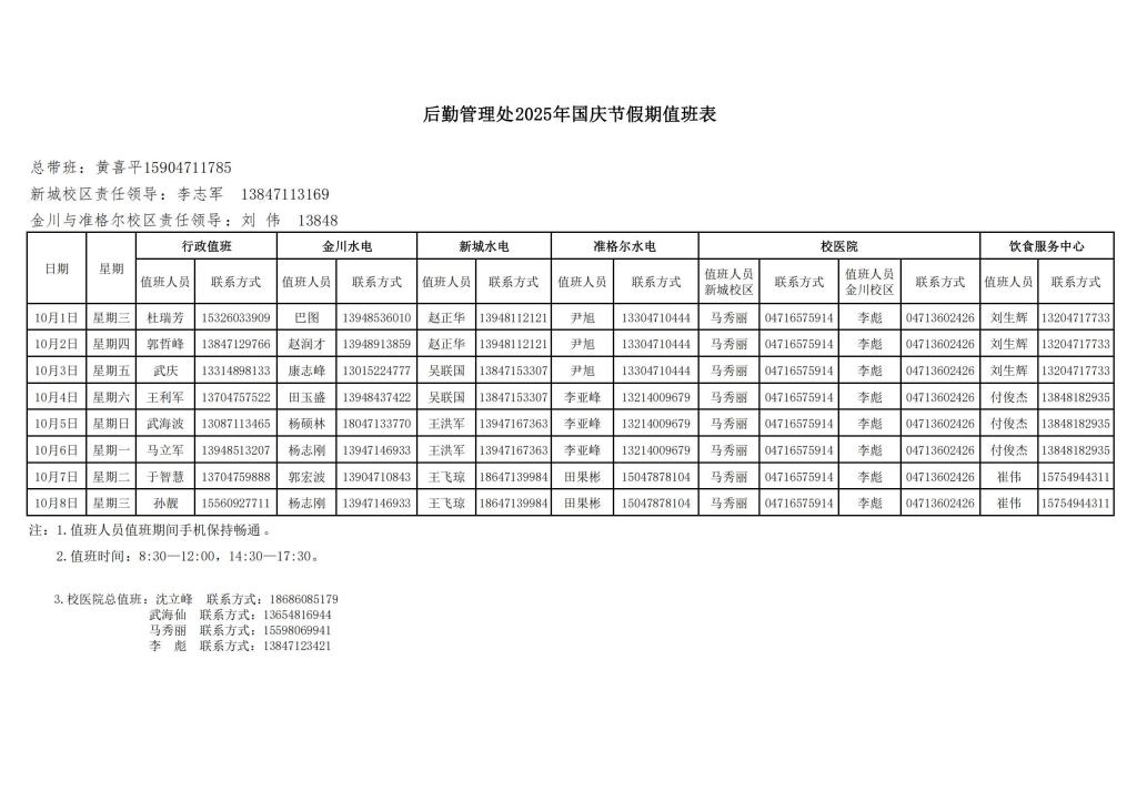 后勤管理处2025年国庆节假期值班表